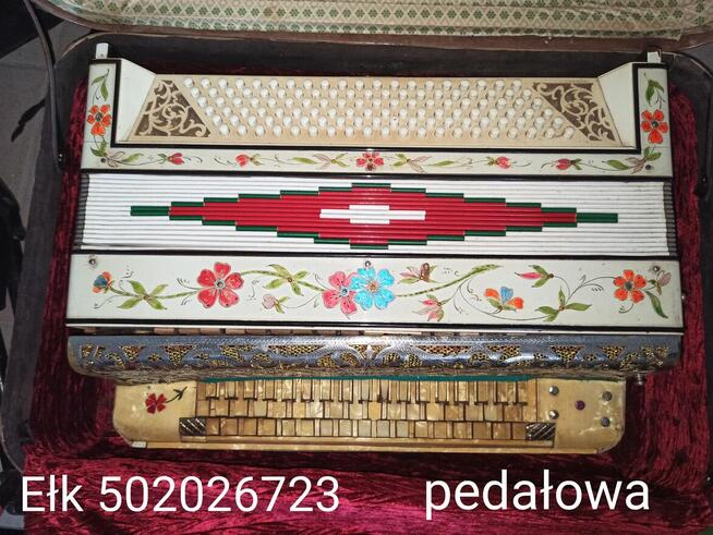 Sprzedam akordeon harmonia zabytkowa pedałowa produkowana na Kurpiach. 2 miechy nożne (pedały) - brak rura metalowa lub ...