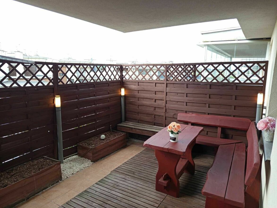 2. Duży zagospodarowany balkon o pow. ok 20 m2,komplet drewniany z dębu- stół i ławki,oświetlenie balkonu